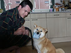 Op de foto zien jullie wie de gelukkige is, ik had namelijk ook voor hem een kado gekocht (samen met vrouwtje) en dat heb ik hem vanmorgen al gegeven toen hij uitgeslapen was (de wekker heeft wel afgelopen hoor) en hij mij uit mijn huisje haalde.