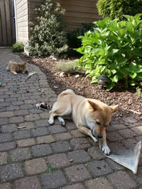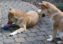 Ben ik samen met Keiko aan het spelen gaat ze ineens met de bal tussen haar poten liggen met een blik in haar ogen van “blijf er af jij”.