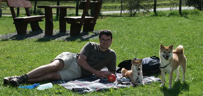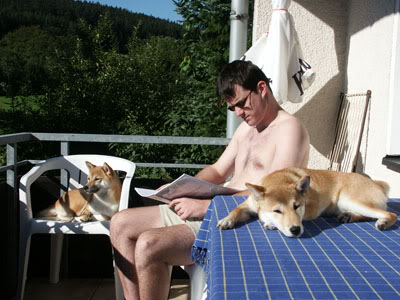 Samen een flinke wandeling maken van een kilometer of 10, dat hebben we niet 1 keer gedaan maar bijna iedere dag, we zijn daar nu ook eens een keer voor naar andere dorpjes in de buurt gegaan.Mensen die wel eens met ons zijn mee geweest weten dat Keiko en ik dan ’s morgens dan al een wandeling er op hebben zitten van huis naar de bakker en terug, want er gaat toch niets boven verse broodjes bij het ontbijt.Hier waren we bij een meertje waar baasje ’s morgens met de huisbaas (Udo) de auto had neergezet en die wij toen weer te voet moesten gaan halen.Udo vond het trouwens super dat we nu twee hondjes hadden en ja hoor we hoefde weer de rekening niet te betalen, dus ook meteen de uitslag van de poll.Na zo’n lande wandeling was het eerst lekker eten op het balkon om daarna te gaan leren.De hondjes hadden dan ook zo hun bezigheden, Keiko hield iedereen en alles in de gaten die langs ons balkon kwamen (mensen, paarden en ook onze overburen de koeien) en Rontu ging gewoon zonnen.Ook hebben we nog andere dingen gedaan.Hier waren we op een ballonfeest waar heel veel luchtballonnen de lucht in gingen en waar ook een kermis bij was.Verder zijn we met z’n alle in een stoeltjes lift naar boven op de berg gegaan om hem daarna weer af te lopen.Mini golf was ook erg leuk, ach en winkelen hoort er ook een keertje bij.