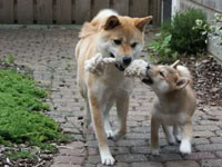 Ze noemde dat ding een frisbee.Dan gooide vrouwtje het weg en ging keiko het halen, maar soms liep Keiko er dan zo mee te schudden dat ze het verloor (of gooide ze het toch zelf weg) en gingen we er weer met z’n tweetjes achteraan.Bijna iedere keer was ik te laat, want die Keiko is toch ook best snel hoor!Als ik er dan als eerste bij was wist ik alleen niet zo goed hoe ik het weg moest gooien, zodat Keiko of het vrouwtje mijn dan maar weer kwamen helpen.Na een kwartiertje zetten Keiko er per ongeluk haar tanden in en toen was het afgelopen met de pret (volgens mij had het vrouwtje er nog meer bij hoor, maar zijn die voor een andere keer).