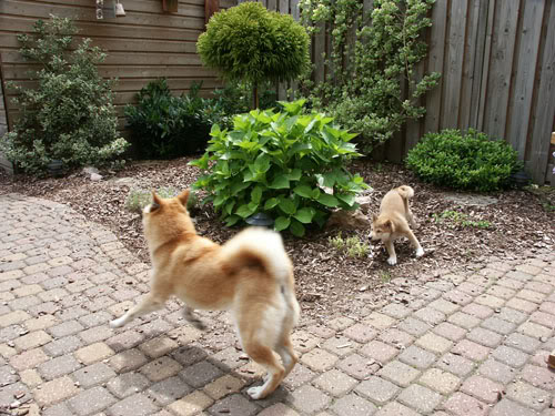 Ik heb vandaag weer achter in de tuin lekker kunnen ravotten met Keiko.Ik ben de kampioen in uitdagen!We deden weer van allerlei spelletjes, van boomschors gooien tot dummie’s apporteren.Dat laatste kan Keiko erg goed en het vrouwtje is mij het nu ook aan het leren.