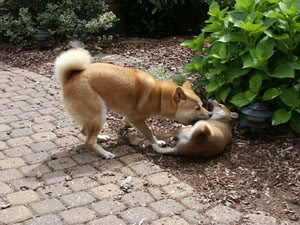 Ze hebben ondekt dat je ook makkelijk is om elkaar te wassen, dus zodoende.Nou is perhondelijke verzorging iets wat erg hoog in het vaandel staat bij Shiba’s dus ook bij die van ons.Ze doen aan tandenpeoetsen, borstelen en Rontu slaat de pedicure/manicure dingen bij Keiko ook niet over.