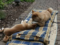 Ze rennen ook wel achter elkaar aan en hangen regelmatig in elkaars kaken, benen, staarten en oren.